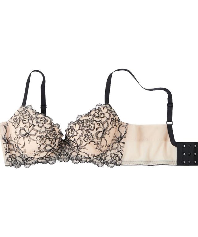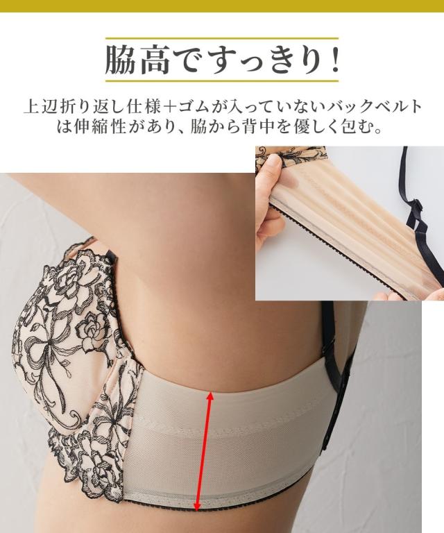 繊細な線画調レースのブラジャー。脇から背中にかけて広範囲の脇肉を包みます。脇上辺は生地折り返し仕様で脇にくいこみにくく段差ができにくい仕様です。 ブラジャー生地はソフトタイプのため軽やかにフィットします。 脇肉すっきり。脇から背中にかけて幅広のベルトでお肉をおさえ段差ができにくい。上辺折り返しのフラット仕様。 コーディネートしてほしいからショーツにもこだわりました。 ・マチは綿混素材で肌当たりが優しい。 ・ストレッチ素材だから体の動きにもフィットします。 細かなディティールにもこだわりました。 4月より新色のネイビー×ピンクベージュを販売開始しました。