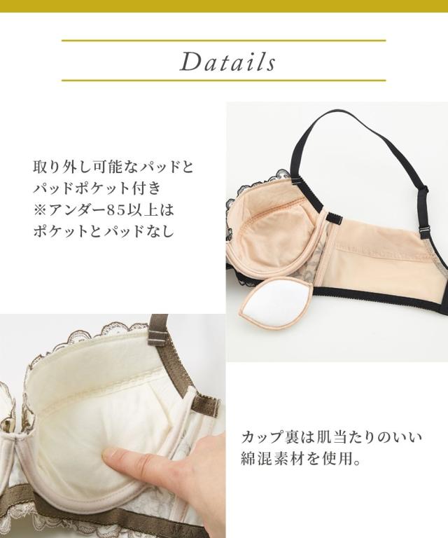品質=ナイロン・ポリエステル・その他 Uバック 3/4カップ ワイヤー入り レース柄の出方が異なる場合があります 後ろホック3段3列 サイドボーン入り パッド入り※アンダー85以上はバッド/パッドポケットともにナシ (取り外し可) ストラップチェンジ不可 原産国:中国 洗濯表示:ブラジャー:手洗い