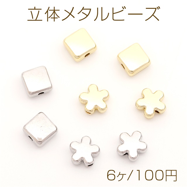 立体メタルビーズ スクエアモチーフ フラワーモチーフ メタリックビーズ 合金製 通し穴あり(6ヶ)