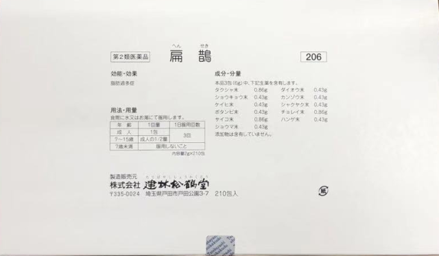 【成分・分量】:本品3包(6g)中) 下記生薬を含有します。 タクシャ末…0.86g、ダイオウ末…0.43g、ショウキョウ末…0.43g カンゾウ末…0.43g、ケイヒ末…0.43g、シャクヤク末…0.43g ボタンピ末…0.43gチョレイ末…0.86gサイコ末…0.86gハンゲ末…0.43g ショウマ末…0.43g 添加物は含有してません。