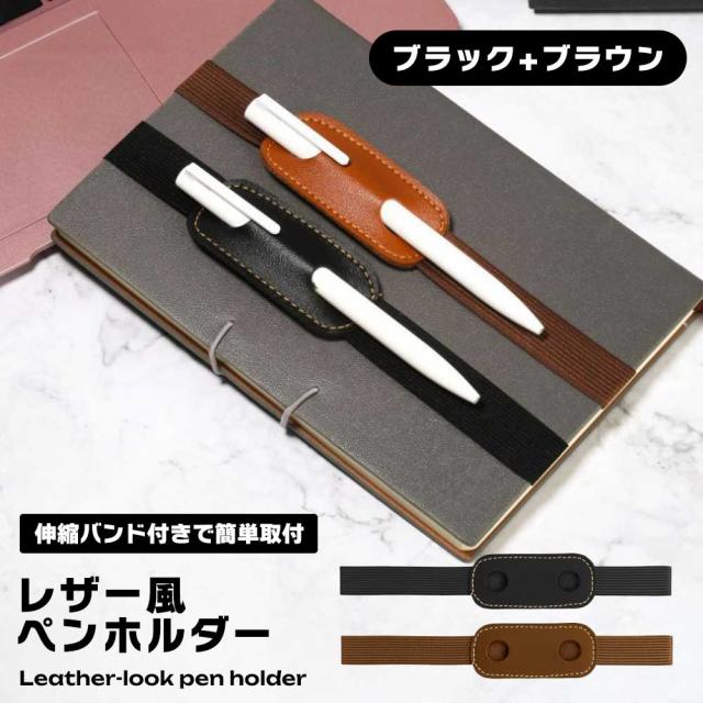 ペンホルダー レザー風 手帳 ノート 伸縮バンド 2色セット ブラック ブラウン PUレザー レザー調 紛失防止 ブックバンド ペンバンド スリム 高級感 簡単 便利 手帳用 伸縮バンド付き 送料無料