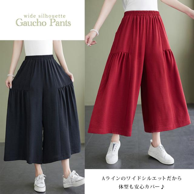 大きいサイズ レディース ガウチョパンツ ワイドパンツ ウエストゴム 無地 (169463)
