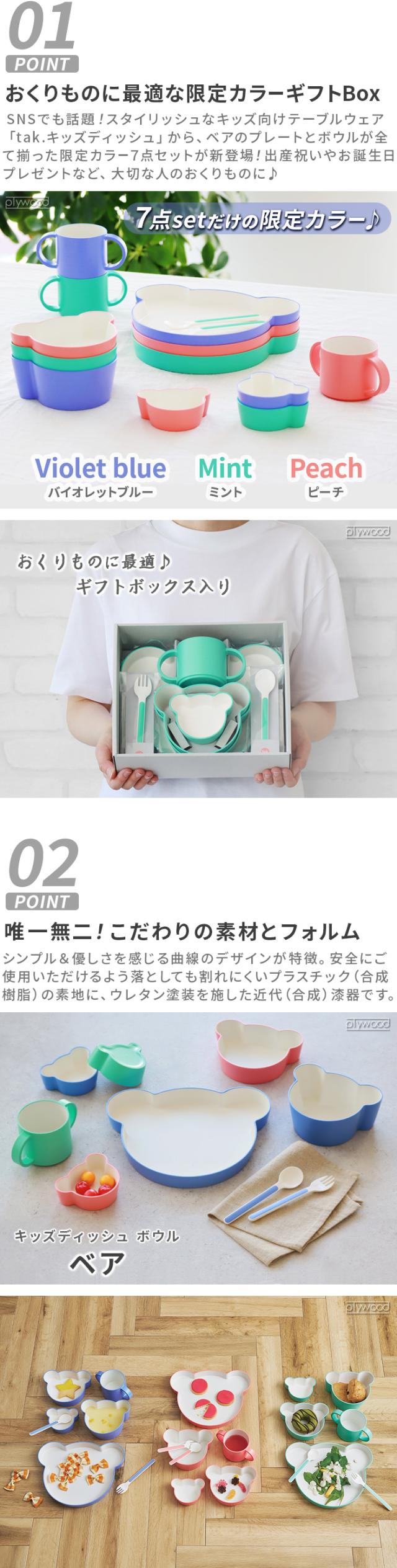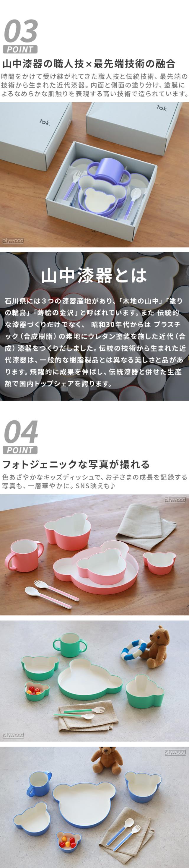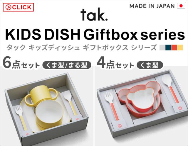 山中漆器の職人技と最先端の技術の融合により、スタイリッシュで実用性の高いプロダクトを発信する「tak.(タック)」から、キッズディッシュギフトボックスのご紹介です。ベアのプレートとボウルが全て揃った7点セット!ギフトボックスでしか出会えない限定カラーは、手に入れられたらラッキー!?贈り物に最適です♪