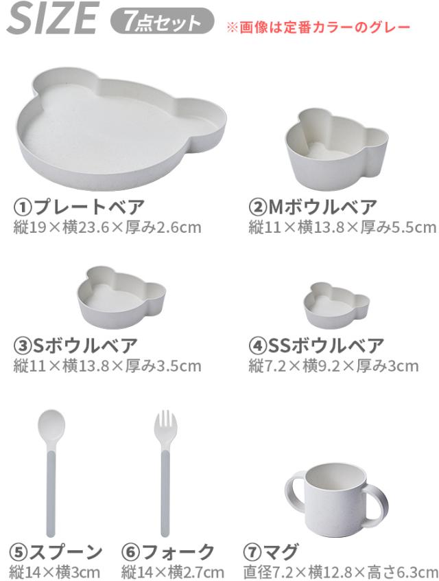 | ≪プレートベア≫ (約)縦19×横23.6×厚み2.6cm ≪Mボウルベア≫ (約)縦11×横13.8×厚み5.5cm ≪Sボウルベア≫ (約)縦11×横13.8×厚み3.5cm ≪SSボウルベア≫ (約)縦7.2×横9.2×厚み3cm ≪スプーン≫ (約)縦14×横3cm ≪フォーク≫ (約)縦14×横2.7cm ≪マグ≫ (約)直径7.2×横12.8×高さ6.3cm |