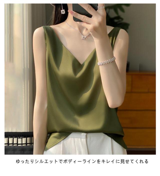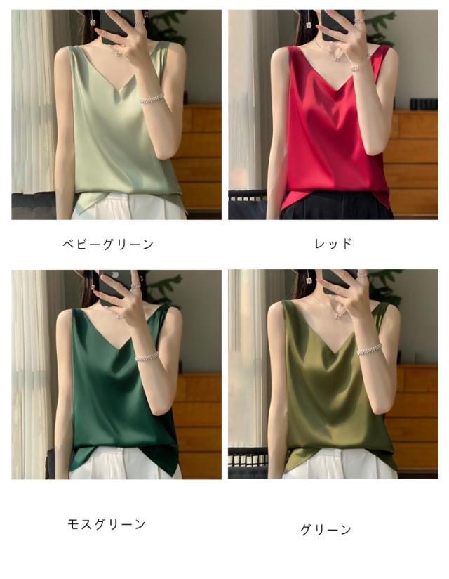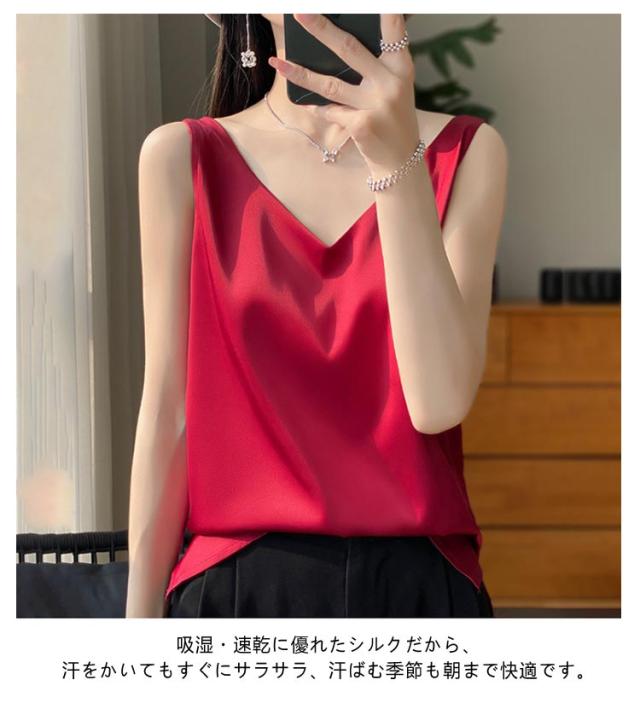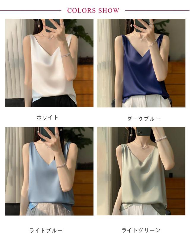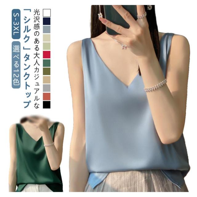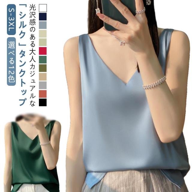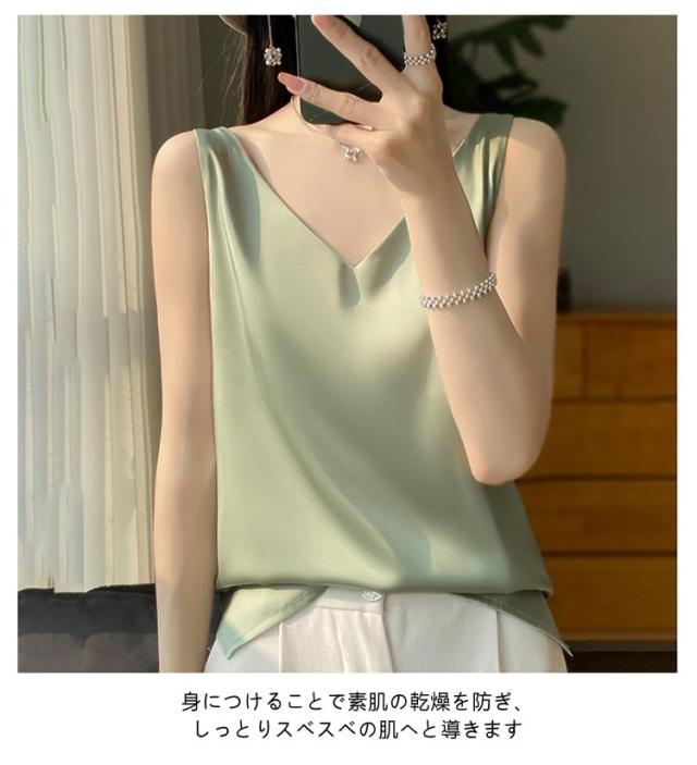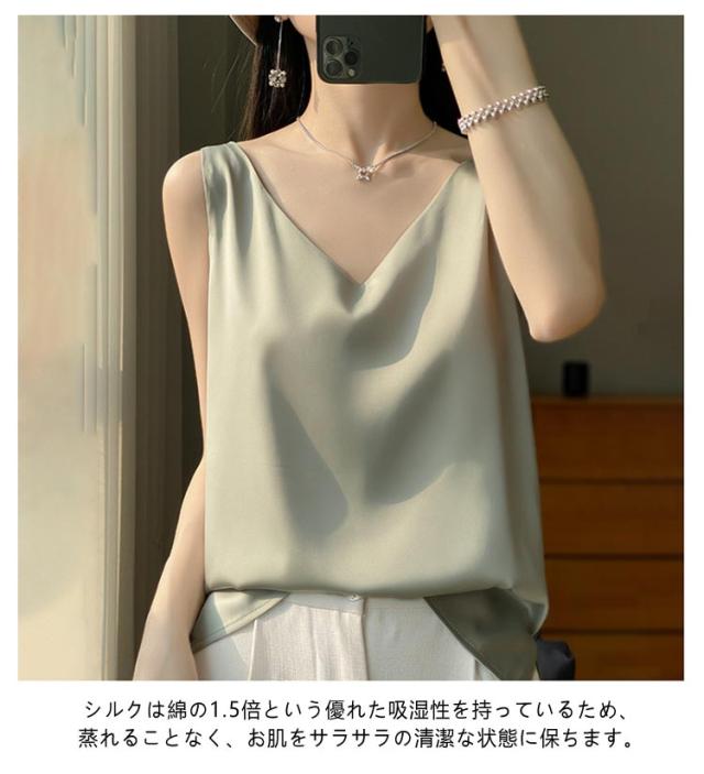 サテン レディース シルク インナー キャミソール タンクトップ ゆったり 大きいサイズ シャツブラウス トップス ブラウス アンダーウェア Vネック 薄手 ショート丈 ノースリーブ 美肌 上品 光沢感 吸湿 通気性 保湿 シルク 敏感肌 大人 普段着 夏 黒 白 グレー