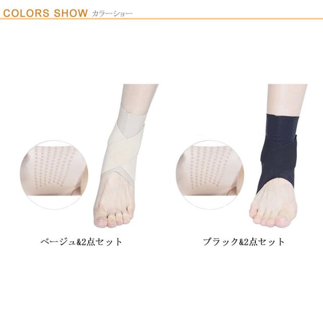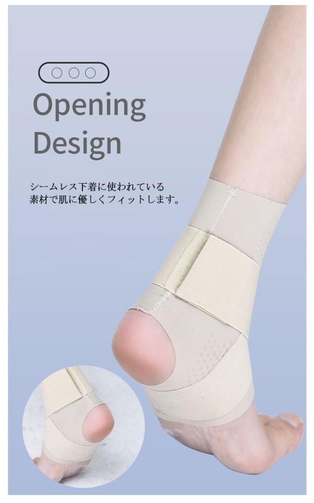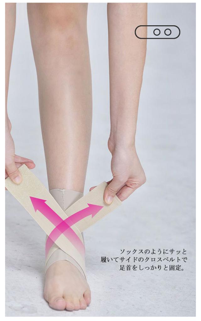 | 締め付け度自由自在の2本のクロスベルトで、足首全体をしっかりホールド。 優しいフィット感なのにしっかりサポート。ストレスフリーにどんどん歩ける! シームレス下着に使われている素材で肌に優しくフィットします。 ソックスのようにサッと履いてサイドのクロスベルトで足首をしっかりと固定。 肌面は優しく、外側はしっかりとサポートするのでズレにくくストレスフリーに歩行ができます | |