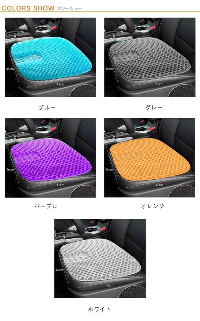 | 柔らかくて、見た目も綺麗で高級感があるシートクッション 寒いほど涼しいシートクッション。暑い夏でも快適なドライブ♪ 風通しのよい3Dパターン形状で長時間座ってもお尻や背中がムレない。 高弾力のシリコンで、体にフィットし、お尻や腰の負担を軽減しながら、凸凹形状でマッサージ効果も◎ 汚れても簡単に水洗いができるので常に清潔に♪ 車シート用だけでなく、アウトドア、デスクワークや在宅勤務などもおすすめです。 | |