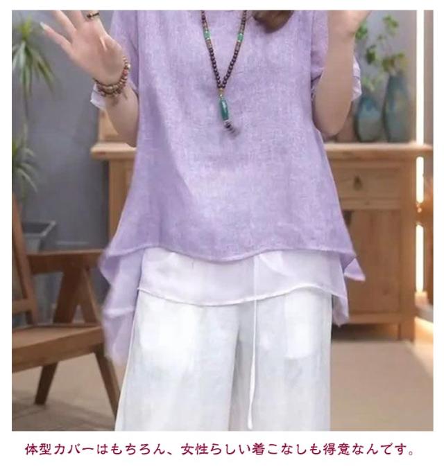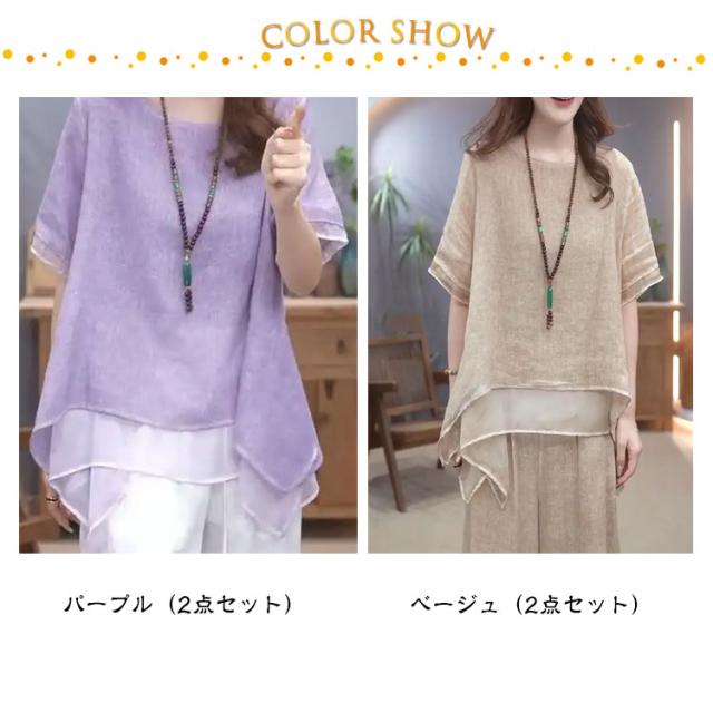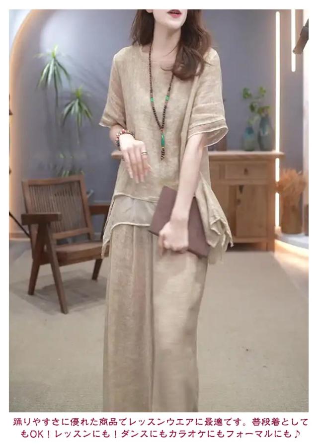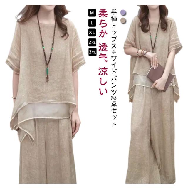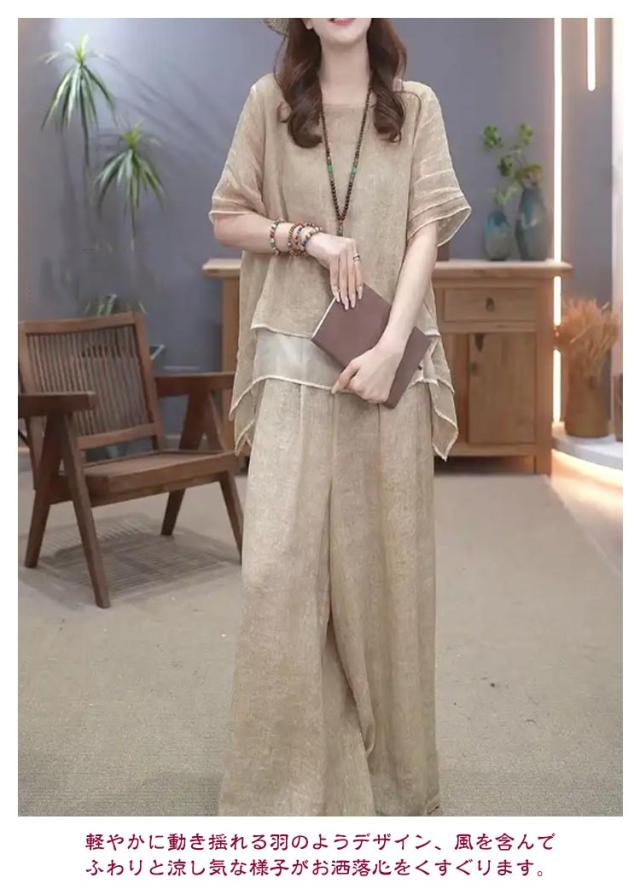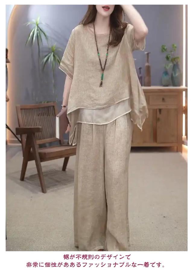 綿麻 セットアップ 秋 体型カバー きれいめ レディース 上下セット 半袖 2点セット 柔らか ゆったり ロングパンツ 春 韓国 大きいサイズ カジュアル ワイドパンツ 夏 透气 セットアップ 涼しい トップス お洒落 綿 無地 ベージュ 通勤 通学 デート コットン