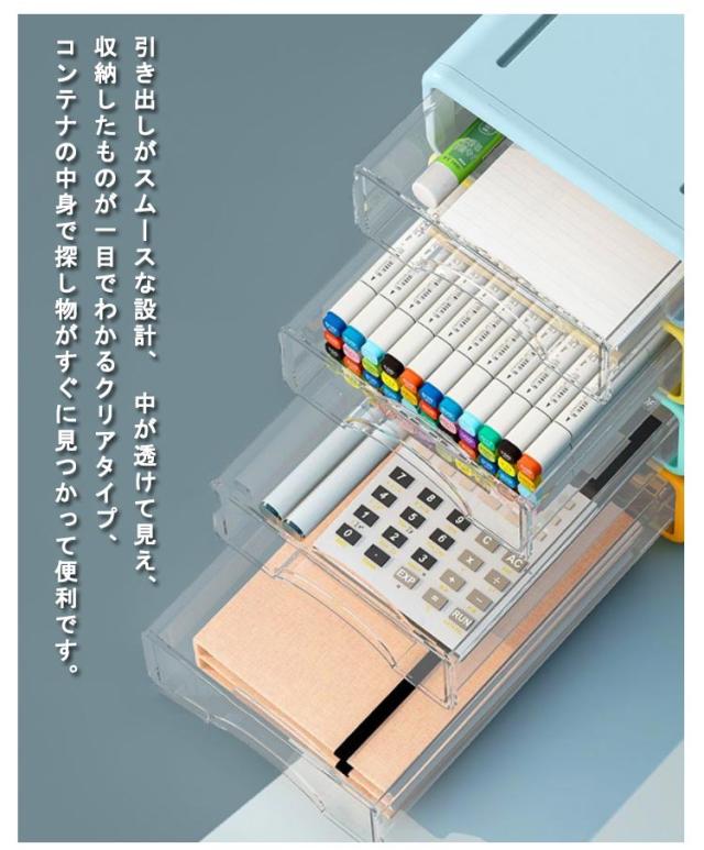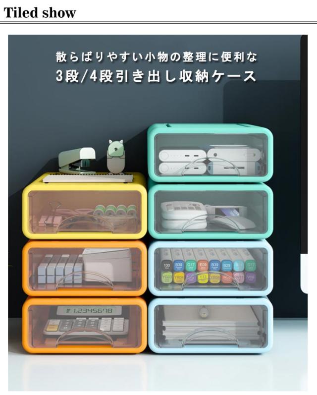 | 散らばりやすい小物の整理に便利な3段/4段引き出し収納ケース 高品質のプラスチック収納ケース。シンプルで実用的な外観、引き出し開け閉めもスムーズ。 文房具、事務用品、化粧品、アクセサリーなどを収納できるコンパクトな整理ボックスで、オフィス、寝室、バスルーム、小物入れとしてお使いいただける便利なサイズです。 引き出しがスムースな設計、 中が透けて見え、収納したものが一目でわかるクリアタイプ、コンテナの中身で探し物がすぐに見つかって便利です。 ケースの上に滑り止めを加工しました。散らかっていた物を整理できます。隙間空間の有効活用。面倒な組み立ては不要。鮮やかなカラーでお部屋のアクセントになります。 | |