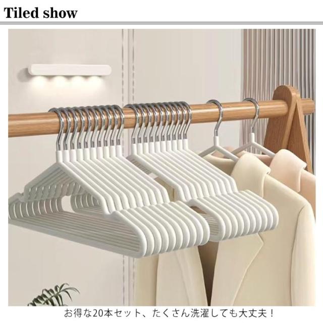 | 滑りにくいコーティングがされたハンガー本セット お得な20本セット、たくさん洗濯しても大丈夫! 滑らないハンガーは、服の形を美しい状態でしっかりとキープ。 特殊なコーティングを施しているので、細身のフォルムでもしっかりと服をキープ。 すっきりとしたフォルムで、クローゼットの容量を最大限活用することができます。 | |