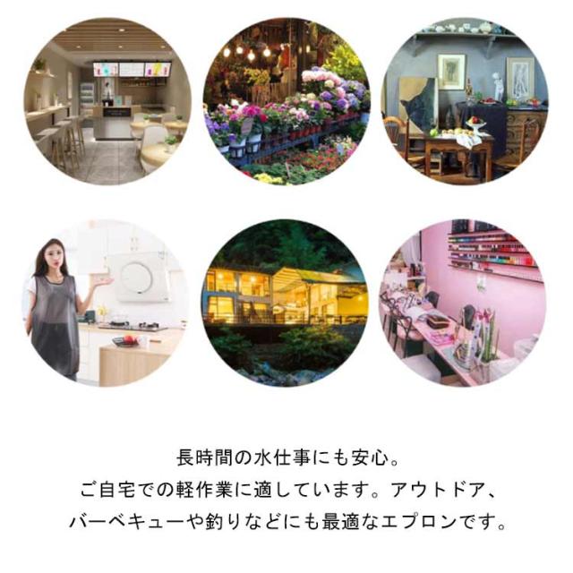 | 耐水性・耐油性のTPU素材のエプロン 食品の汚れや油分から守り、お手入れも簡単です。軽量、撥水効果も高く、どこでも使えるシンプルなデザインのエプロンです。 汚れても洗濯して繰り返しご使用頂けます。干す際にはしわをしっかり伸ばすことで、アイロンなしでそのままご使用頂けます。 後ろはメッシュ素材、蒸れない快適な着心地。 丈夫で、縮みにくく、しわにもなりにくい。ガーデニング、絵画・陶芸など趣味の場のご使用として大人気。 長時間の水仕事にも安心。ご自宅での軽作業に適しています。アウトドア、バーベキューや釣りなどにも最適なエプロンです。 | |