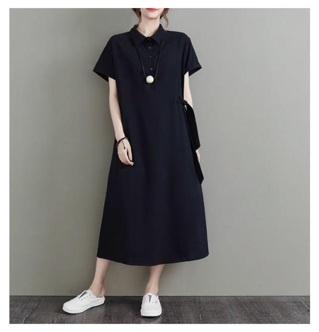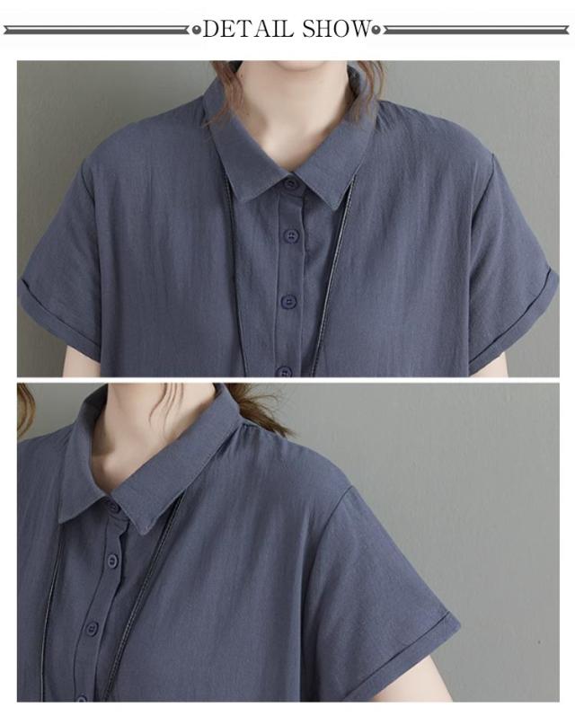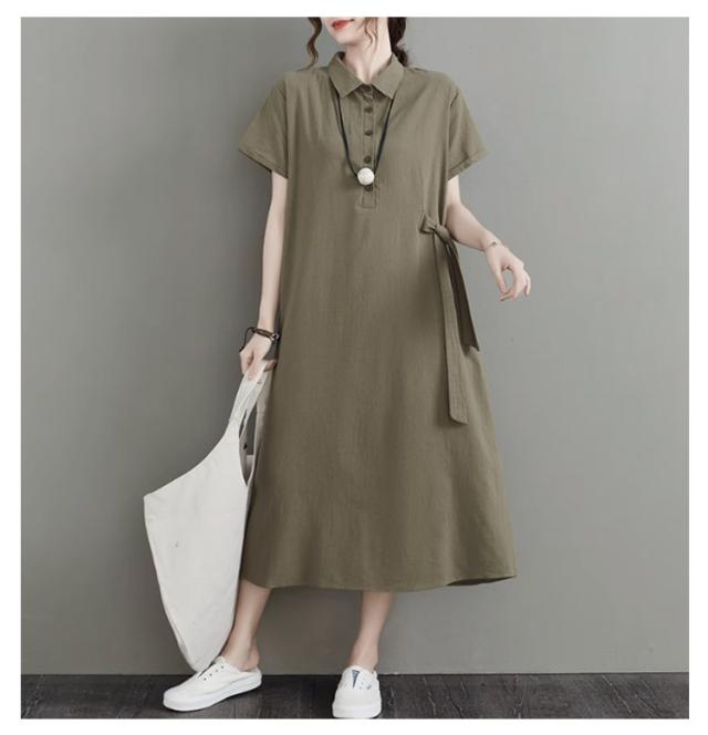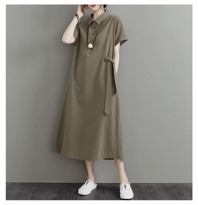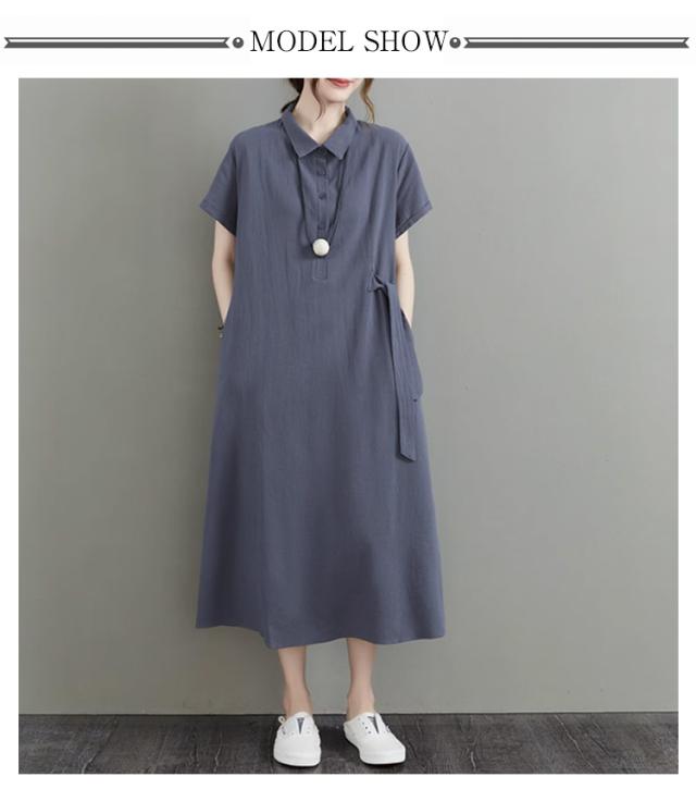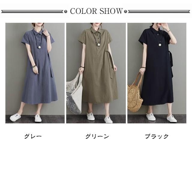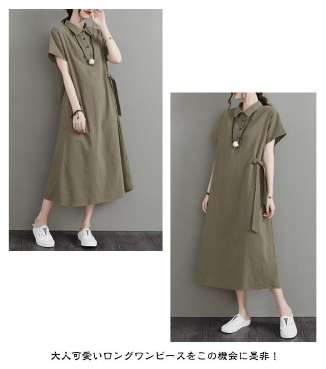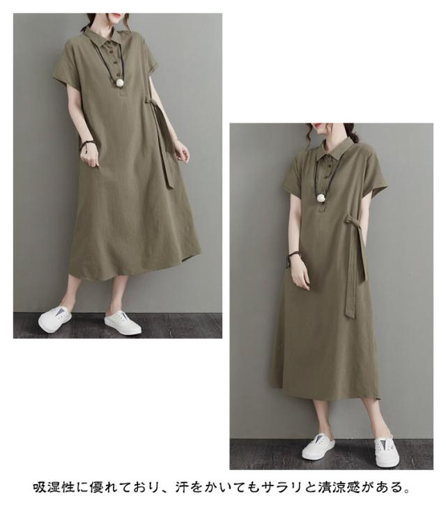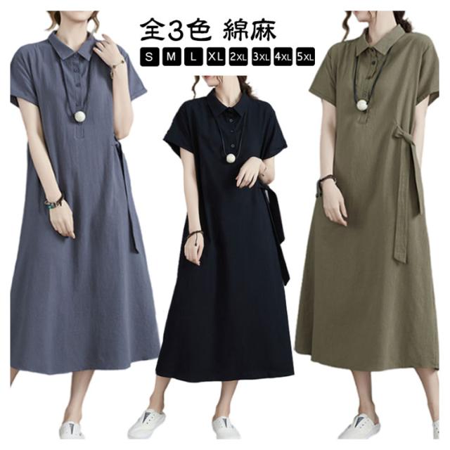 きれいめ ロングワンピース ワンピース ロング Aライン 夏 ナチュラル 半袖 襟付き 綿麻 涼しい ワンピース 二の腕カバー 大きいサイズ シャツワンピース ポケット付き ポロシャツワンピース 無地 シンプル カジュアル