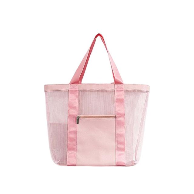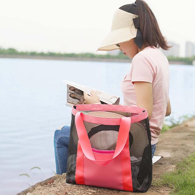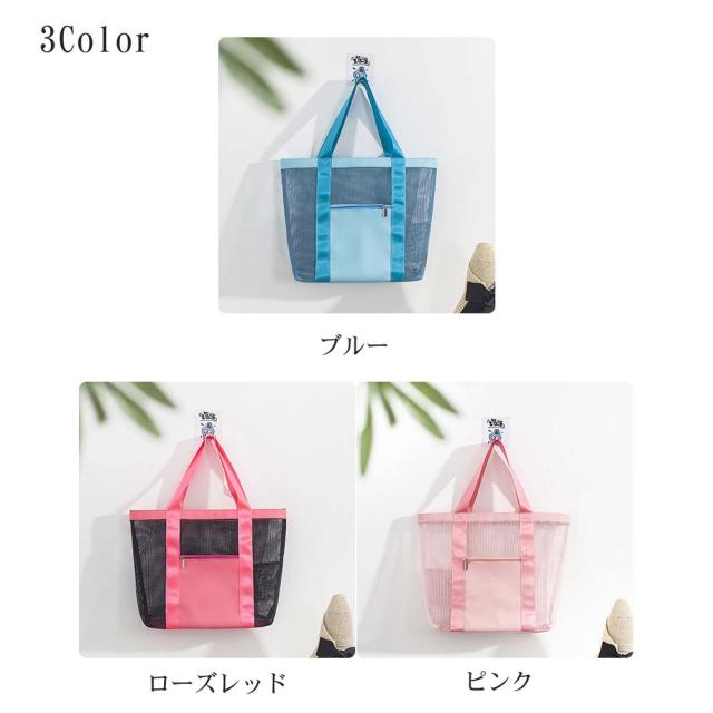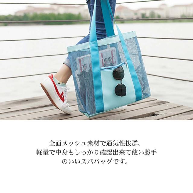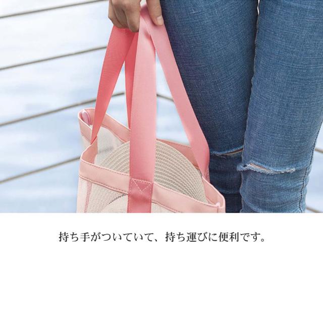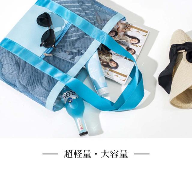 全面メッシュ素材で通気性抜群、軽量で中身もしっかり確認出来て使い勝手のいいビーチバッグです。