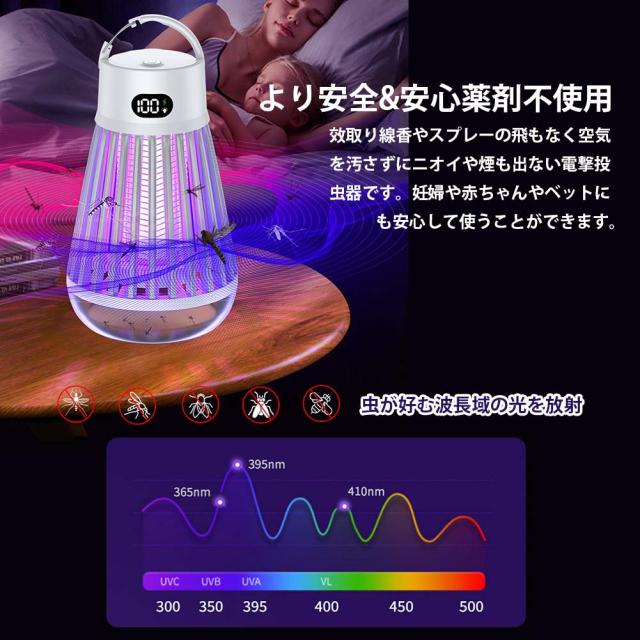【新版電撃殺虫器・LEDランプ照明】最新技術を使用し、補虫蛍光管を内蔵してパワーアップ、従来品より有効範囲が広がりまして、360°全方位スキャナーしたりして蚊などを誘惑します。内部には密集する静電ネット式設計で、害虫が内側の高圧電撃ネットを触れると瞬時に感電死させます、殺虫効果抜群です。虫対策として、蚊に刺されない、安心で眠れる環境を作ってくれて、夏場に欠かせない蚊取りライトです。また、この電撃殺虫器にはLEDライト機能も付いています。LEDランタン照明と電撃殺虫を同時利用することができます。3つのモードが調整可能で:殺虫モード、照明モード、殺虫+照明モード。UV光源式蚊取り器だけでなく、飾りの照明ライトとしても使えます。