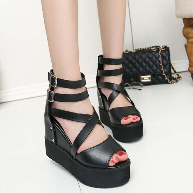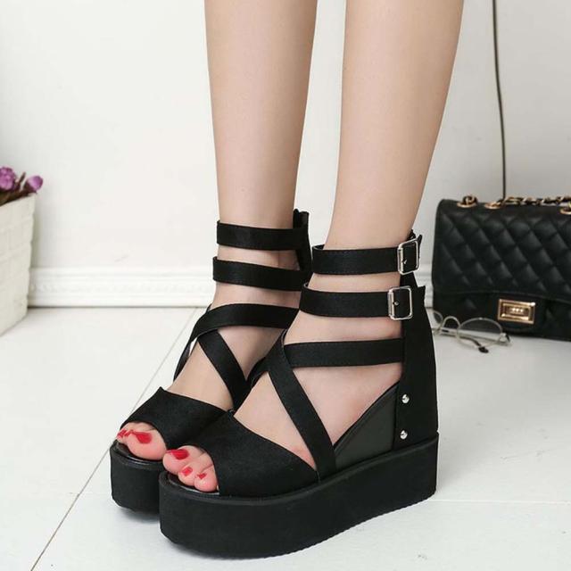 厚底サンダル レディース オープントゥ バッグジッパー ウェッジ 14cmハイヒール 夏 5.5cm防水台 歩きやすい 黒