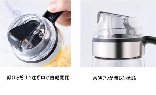 片手で本体を傾けるだけで注ぎ口が自動開閉! 自然の力で注ぎ口が自動開閉する仕組みになっています。 自動開閉のため、中身をそそぐ時以外は常時フタが閉じた状態。 ガラスボトルのみ食洗機の利用可能です。キャップ手で洗浄ください。 液だれしにくい構造で、ボトルがベタベタになったり、手が汚れたりしません。 オリーブオイルやごま油、サラダオイルなどを入れるオイルポットとしてはもちろん、 ビネガー、醤油、酒、みりんなどの調味料入れとしても。 高品質のホウケイ酸ガラスの高温と耐腐食で作られています。 本体ボディは透明なガラス製で中身や残量がよく見えるようになっています。 キッチンにも、テーブルにも、様々なインテリアにマッチするデザインです。 ★中国製