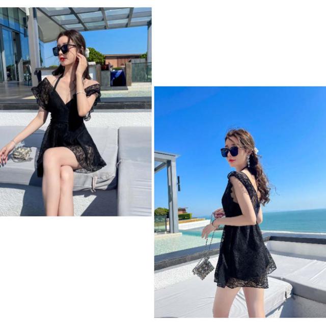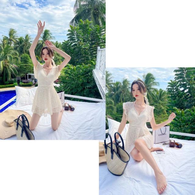 深Vの胸元、とても女性らしくセクシーなワンピース水着です。気になるお腹周りはすっぽり隠し、フレアなスカートで太ももやお尻までカバーできちゃいます◎ハイウエストな位置でのマークで脚長効果も抜群、可愛くスタイルアップが叶う優秀アイテムです。