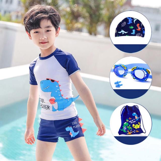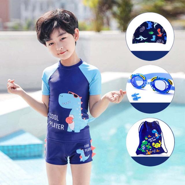 【5点セット】半袖、短パン、水泳帽子、水泳ゴーグル、バッグ、揃っている男の子水着5点セット。海水浴、夏のキャンプ、カヤック、ビーチ、サーフィン、プールの授業など、様々な水上スポーツやアウトドア活動に適しています。