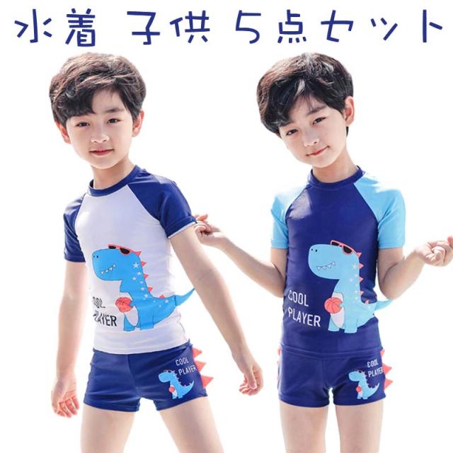 水着 子供 男の子 5点セット半袖 サーフパンツ 水泳キャップ 水泳ゴーグル キッズ 水着 上下セット セパレート UVカット スイムウェア 水泳 海水浴 海辺 温泉 水遊び プレゼント