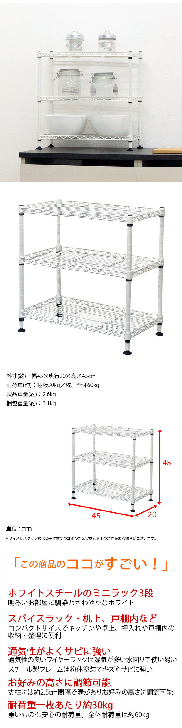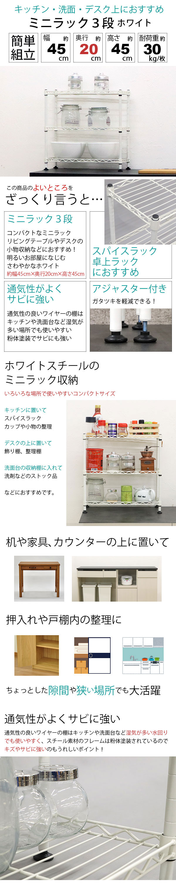 商品名:卓上 ラック ミニ 3段 45幅 収納 棚 おしゃれ ミニラック キッチンラック ホワイト 白 幅45cm 奥行20cm 高さ45cm 頑丈 丈夫 デスク上 シンク下 収納 三段ラック オープンラック スチールラック 隙間収納 スパイスラック コンパクト 一人暮らし ワンルーム シンプル 可動棚 ポール径14mm スリム 省スペース 調味料ラック デスク下 ラック 机下 玄関収納 多目的ラック フリーラック 整理整頓 組立簡単 アジャスター付き