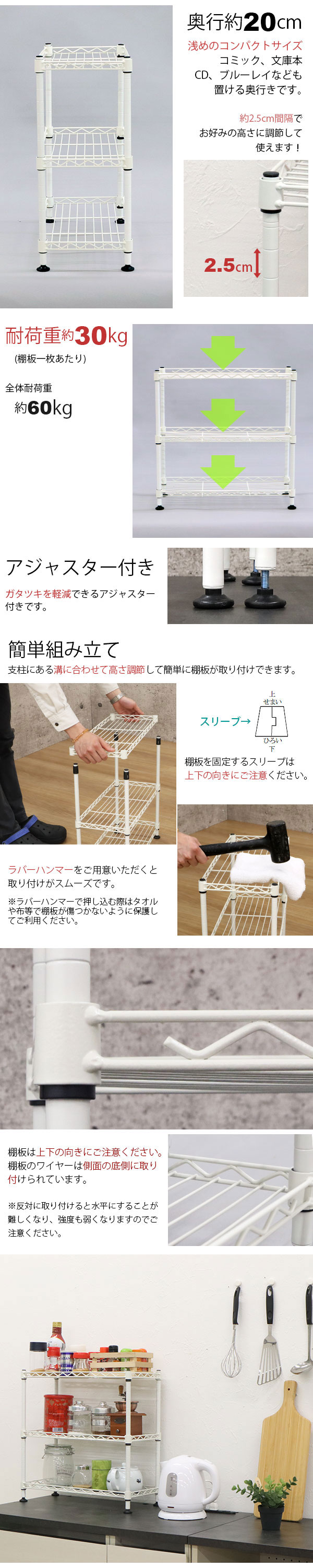 小物を置く 14φ すき間 キッチン下 高い収納力 小物の落下防止 収納したいものに合わせて棚板の高さの微調整がしやすい ガタ付きを軽減 別売りの専用キャスターと合わせて使用可能