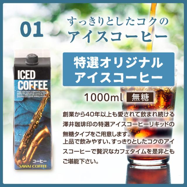 | 内容量 | ・特選オリジナルアイスコーヒー 無糖 1000ml ・甘熟紅茶 無糖 1000ml ・やさしいオレンジ 1000ml |