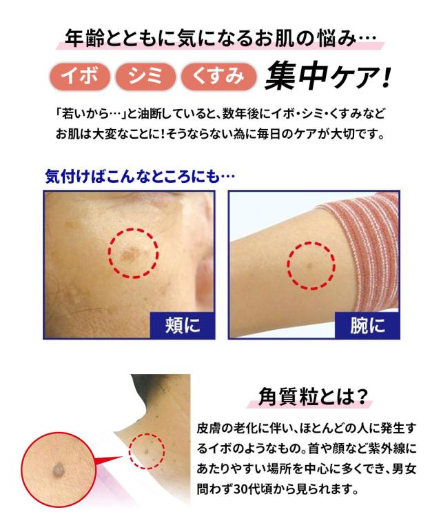 年齢を重ねるごとに気になるお肌のイボ・シミ・くすみを毎日の集中ケアで解決!また、美白対策としても使えます!