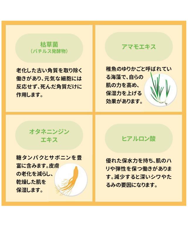 他にも、保湿・保水力を高めるアマモエキス、オタネニンジンエキス、ヒアルロン酸。老化した古い角質を取り除く枯草菌(バチルス発酵物)。ミネラルが多く含まれた保湿・消臭効果に優れているヨクイニンエキスを配合。