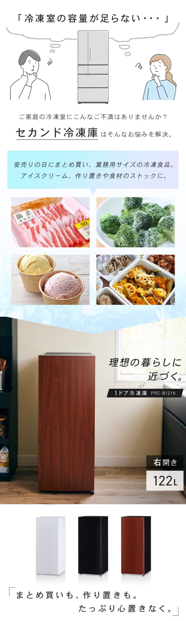 冷凍庫 家庭用 122L 1ドア コンパクト 霜取り不要 ファン式 冷凍 冷蔵切替可 右開き 自動霜取り 5段収納 2段トレイ 3段クリアケース 一人暮らし ひとり暮らし 家族 新生活 作り置き ストック サブ冷凍庫 セカンド冷凍庫 PRC-B121N *