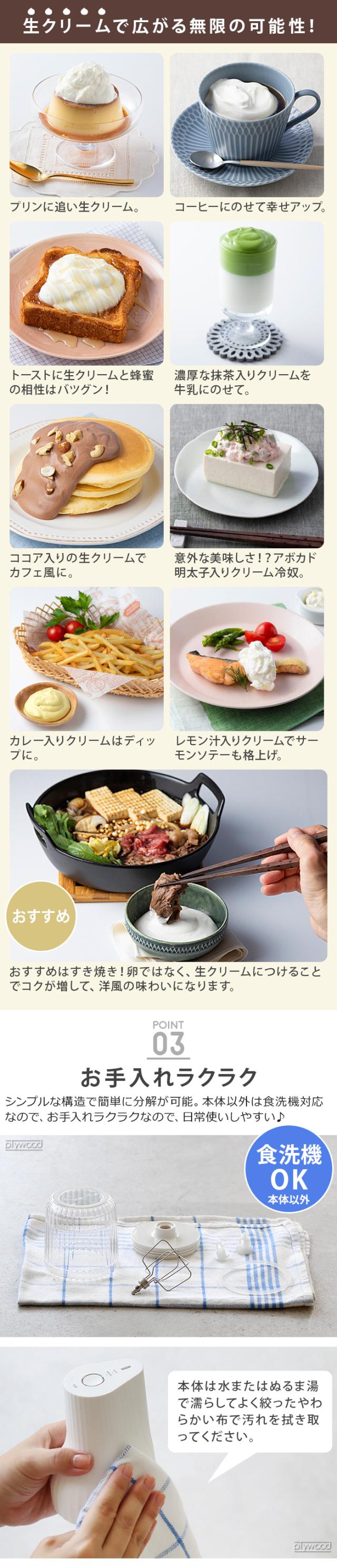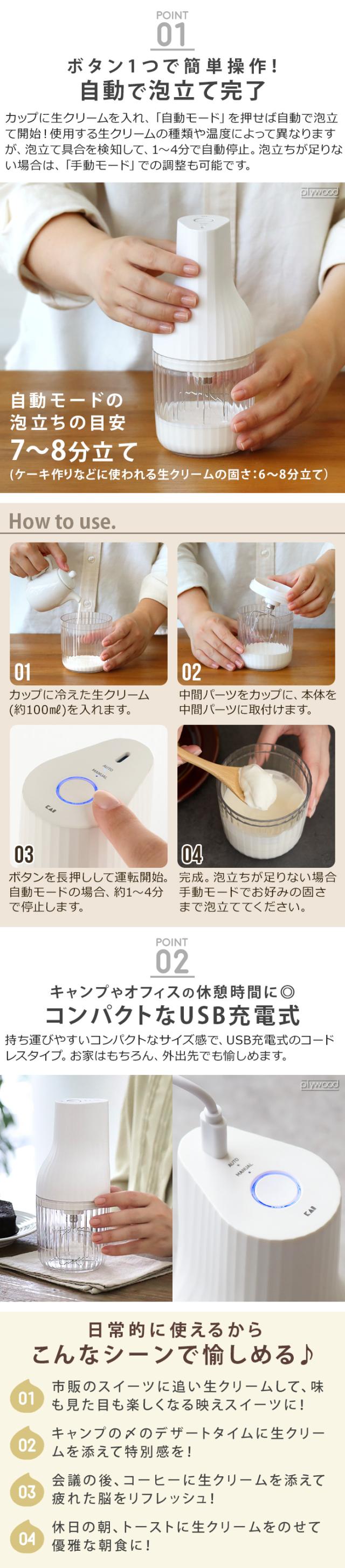 ボタン1つで簡単に生クリームを泡立てられます。「自動モード」を押せば泡立て具合自動で検知、クリームの固さを7〜8分立てに仕上げます。泡立ちが足りない場合は「手動モード」での調整も可能です。パーツは分解が簡単で、本体以外は食洗機対応でお手入れもラクラク。牛乳瓶のようなフォルムと生クリームのようなデザインで、贈り物にも◎。USB充電式のコードレスタイプなのでいつでもどこでも生クリームが愉しめます。