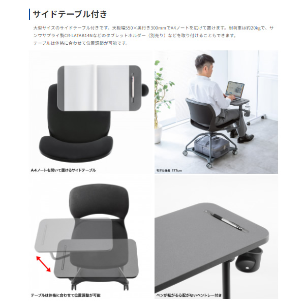 大型サイズのサイドテーブル付きです。天板幅550×奥行き300mmでA4ノートを広げて置けます。