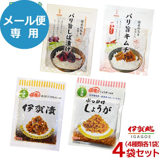 漬物 伊賀越 (伊賀漬/しょうが/しば漬け/キムチ) 4種類 惣菜 国産 漬け物 セット 送料無料 (メール便/同梱不可)【_■東海_