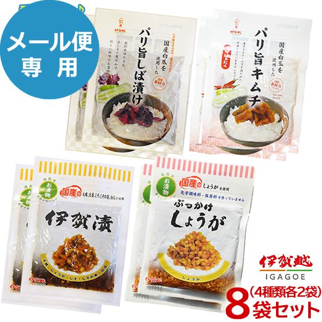 漬物 伊賀越 4種セットダブル (伊賀漬/しょうが/しば漬け/キムチ) 各2袋入 惣菜 国産 漬け物 セット 送料無料 (メール便/同梱不可)【_■東海_
