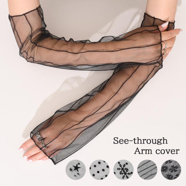 新作 選べる5柄 ブラック シースルー アームカバー レディース ロング丈 長い 薄手 シアー レース 透け感 メッシュ 夏 腕カバー 可愛い おしゃれ カジュアル 柄 UVケア 日焼け防止 お出かけ 大人 通勤