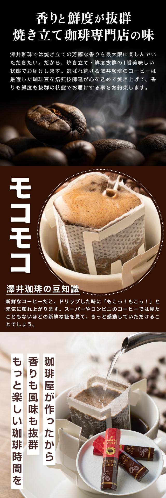 澤井珈琲(さわいこーひー)では、お客様のお家に商品が届き、箱を開けた瞬間。そして、トレードマークの赤いコーヒー袋の封を開けた時に鮮度抜群の「香り高さ」と、飲んだときの「味わい」に感動して頂けるように、レギュラーコーヒーはご注文を頂いてから焙煎をして焼きたてのコーヒー、コーヒー豆、珈琲、珈琲豆をお届けをしている焼き立て珈琲専門店です。お客様に「美味しい」と言って喜んで頂く事が私たちの喜びと思ってます。「美味しいコーヒーをお届けしたい」と想い続けて生まれたこだわりの味を、どうぞ、この機会にお楽しみくださいませ。澤井珈琲では、コーヒー豆は挽き方がご選択いただけます。珈琲豆を挽く事をお楽しみ頂ける『豆のまま』や、私共の専用の特注サイズの大型のミルで挽いて、コーヒー粉の状態にしてお届けする方法がございます。中挽き、細挽き、粗挽き、荒挽きなど様々な挽き方がございますが、私共がお薦めする『店長のおすすめ挽き』にて、そのコーヒーに合った一番美味しいと思える挽き方に挽いてお届けします。東京の銀座にも実店舗を構え、都内では浅草やスカイツリーのあるソラマチにも出店。「鳥取のコーヒー屋さん」とも呼ばれてますが、空気が綺麗で自然豊かな鳥取県に焙煎工場を構え、隣接する島根県の松江市や出雲市にも実店舗がございます。顔の見えないネット通販ですが、全国11店舗を展開する安心安全な澤井珈琲は、特徴的な「赤いコーヒー袋」に入れて、全国の珈琲好きにお選び頂いてます。よく間違えられる名前として、沢井珈琲、沢井コーヒー、澤井珈琲店、澤井珈琲本店、さわいこーひー、サワイコーヒーなどがございますが、正式名称は澤井珈琲となります。