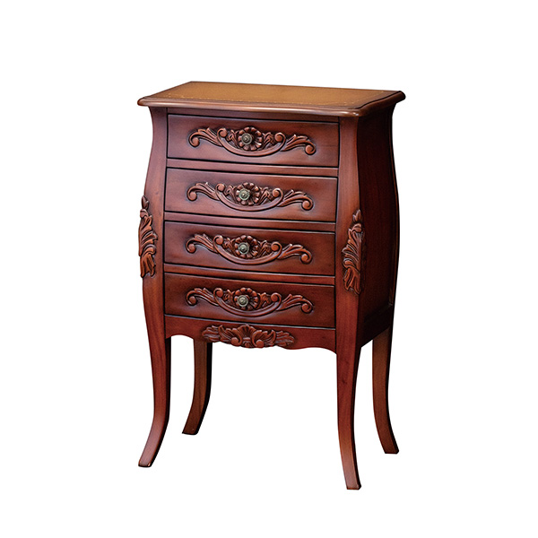 天板はレザー調の特殊な仕上げになっておりますので、高級感があります。手彫り仕上げ、引出内部の底はフェルト貼りなど、細部にまで工夫を凝らしております。玄関やリビングでもお使いください。