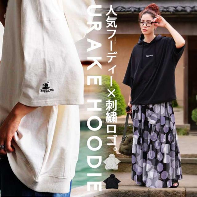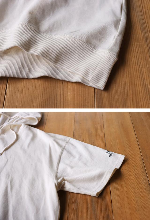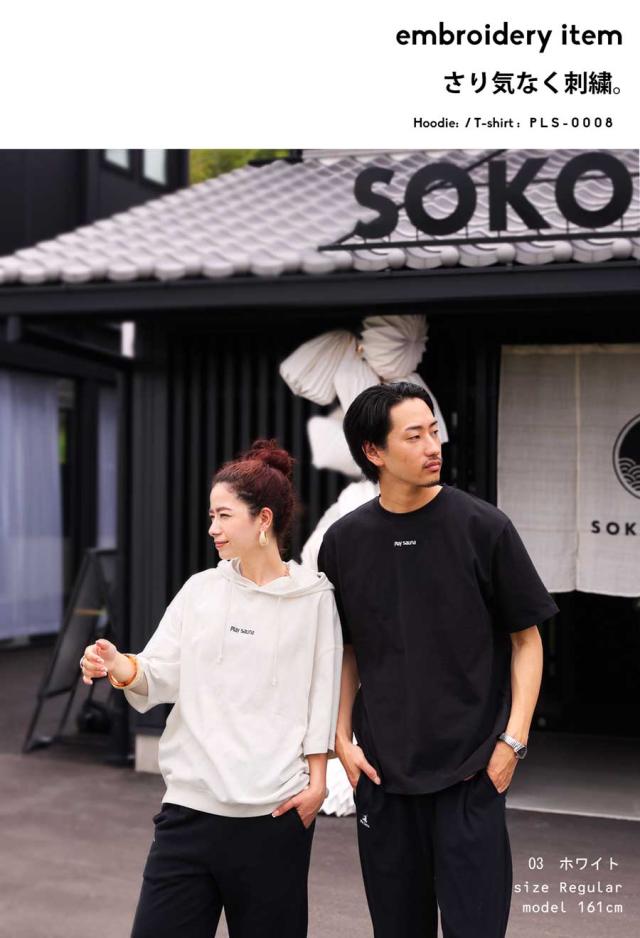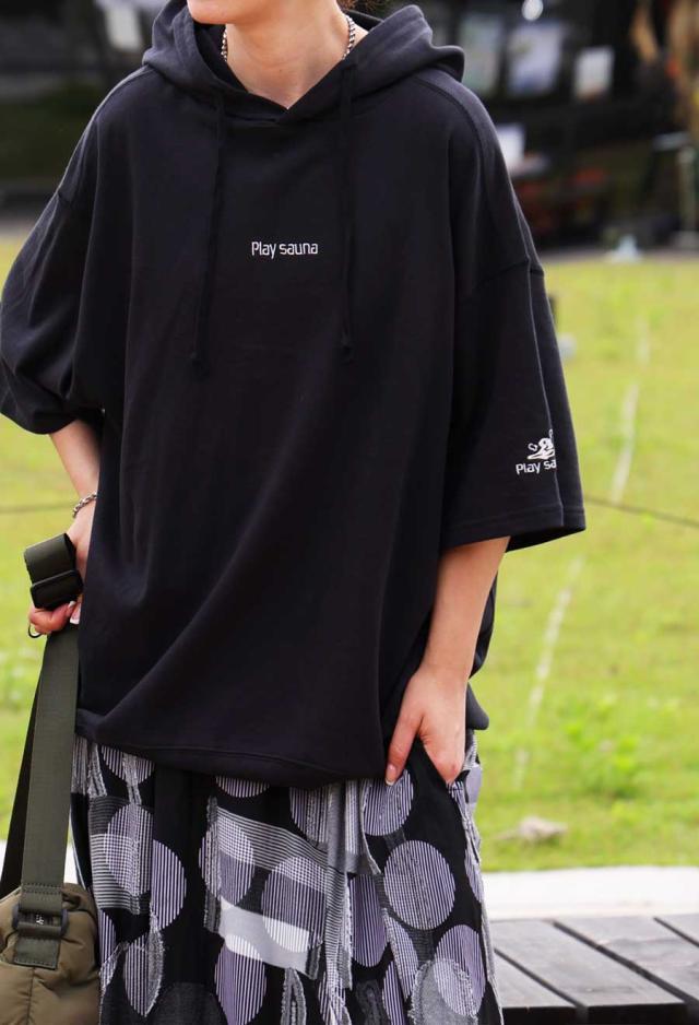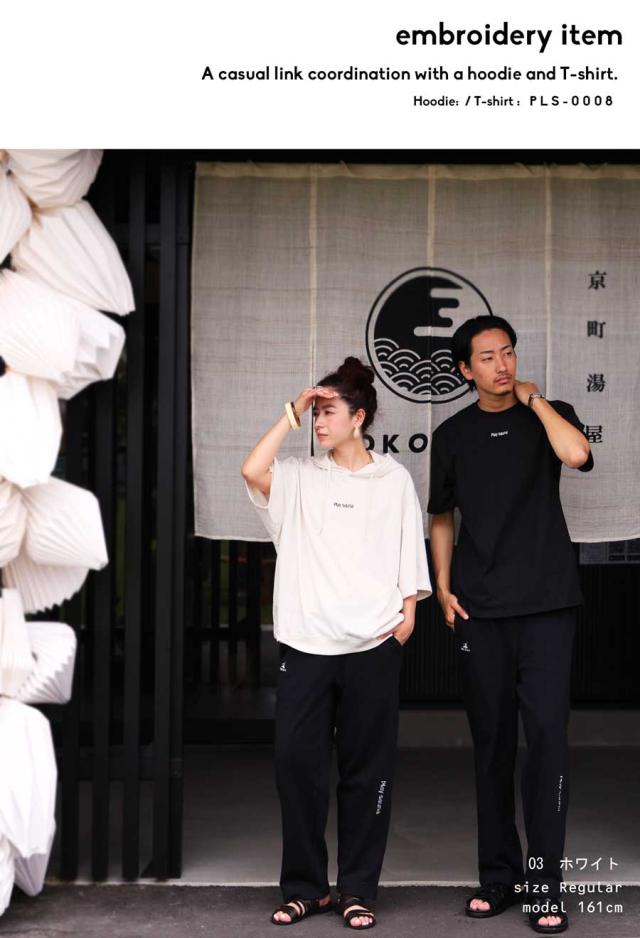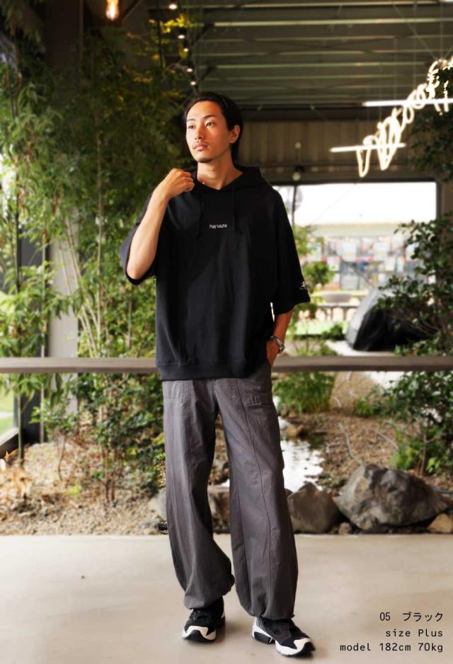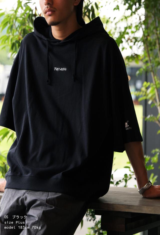 pls-0011 綿100 フード付き 紐付き プルオーバー 半袖トレーナー 半袖フーディ ロゴ 刺繍 刺繍ロゴ ワンポイント リブ ゆったり サイズ展開 シンプル ラフ 大きめ ユニセックス
