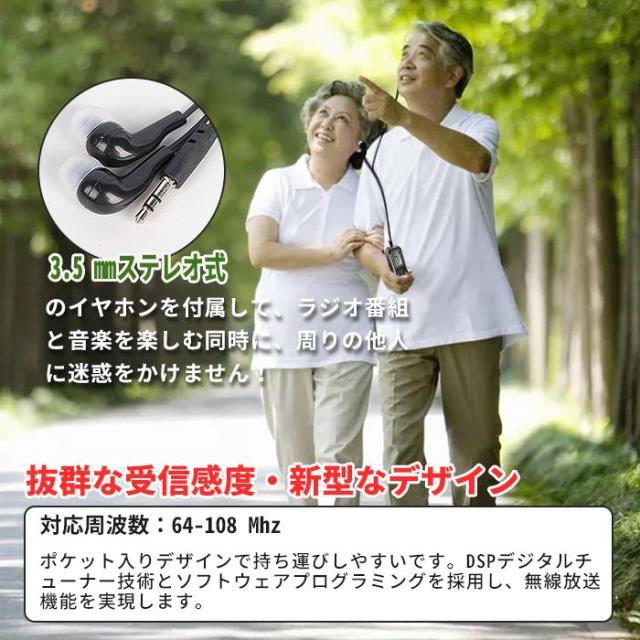 【高音質・持ち運びやすく】3.5 mmイヤホンを付属して、ラジオ番組と音楽を楽しむ同時に、周りの他人に迷惑をかけません!ポータブルラジオのサイズは80x28x20mm、小型でコンパクトで、持ち運びやすいです。ストラップ付き、首に掛けたり、手に掛けたりできます!