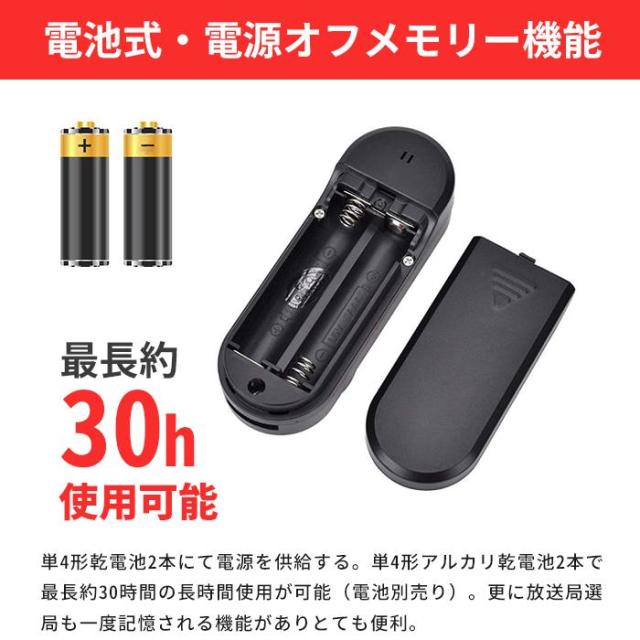 【電池式・電源オフメモリー機能】単4形乾電池2本にて電源を供給します。単4形アルカリ乾電池2本で最長約30時間の長時間使用が可能(電池別売り)。更に電源オフ後メモリー機能を備えており、次回からの使用はもっと便利に操作可能です。保存されたラジオ放送局は、シャットダウンまたはバッテリの交換のために失われません。