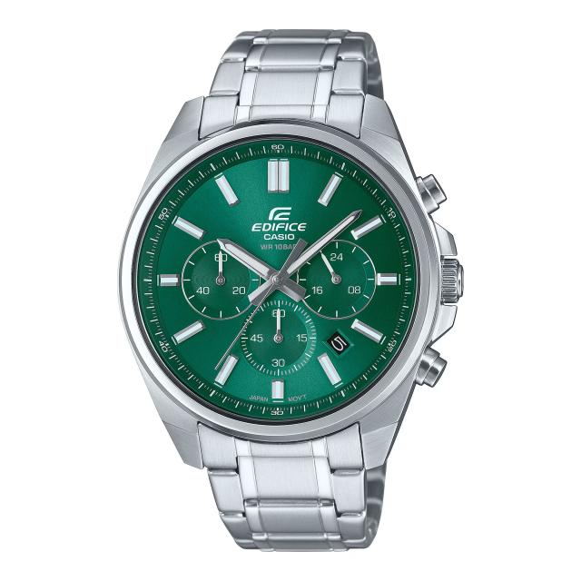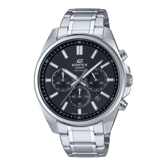 EDIFICE ベーシックスタイルのクロノグラフです。ケース径はミッドサイズ、ベゼルを薄く文字板をワイドにデザインしスタイリッシュに仕上げました。