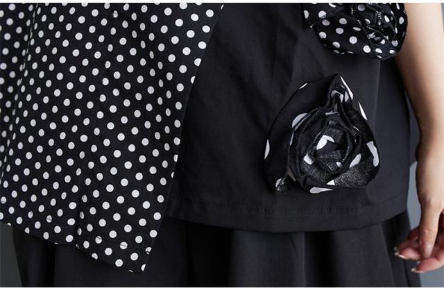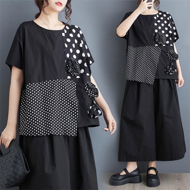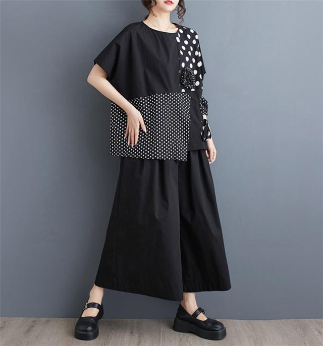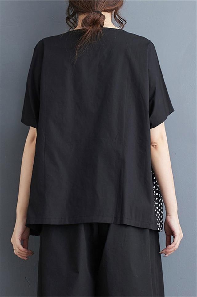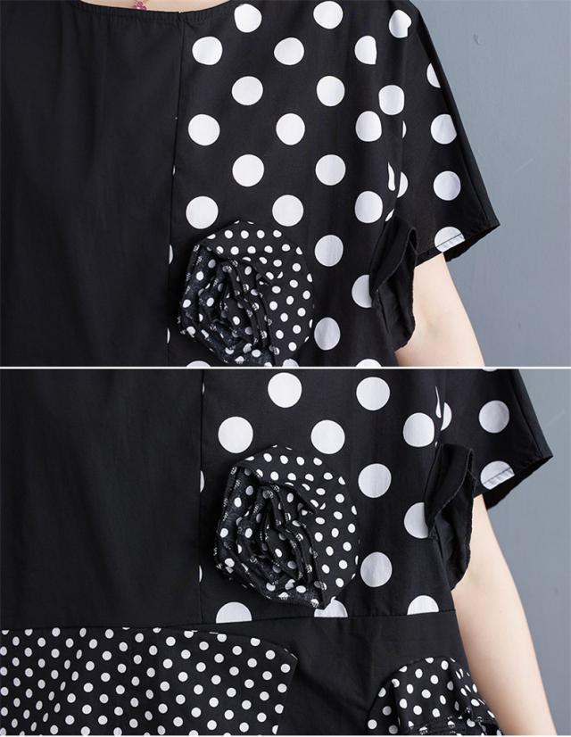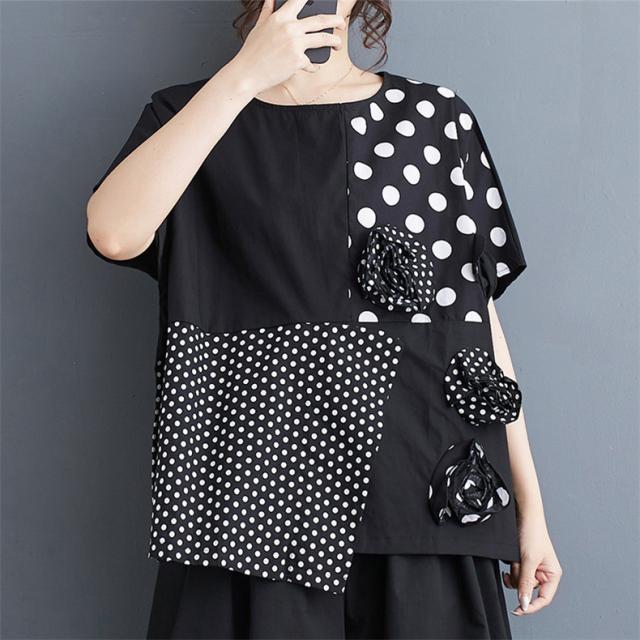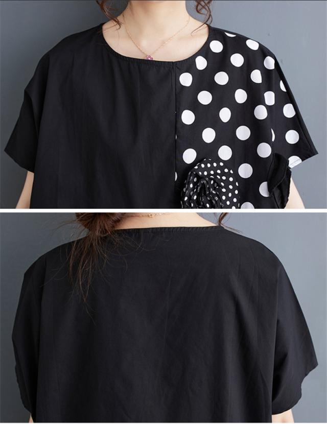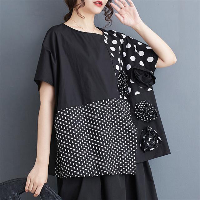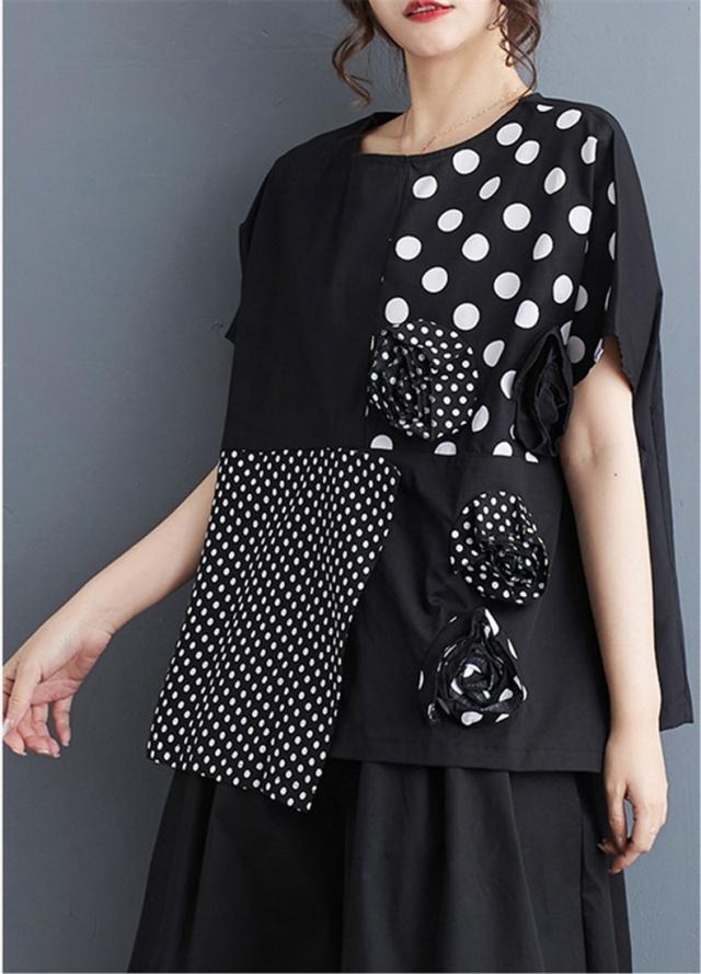 シャツ レディース トップス 半袖 丸首 クルーネック 切り替え ドット柄 異素材 パッチワーク プルオーバー 立体的 フラワー 大人カジュアルなスタイルに