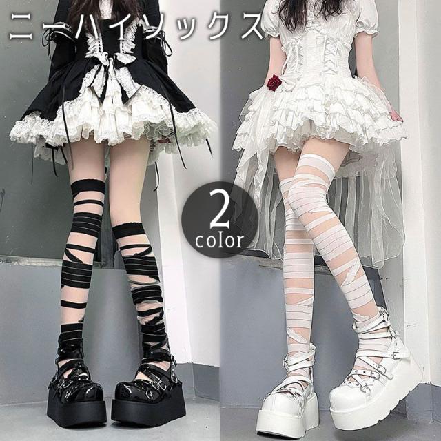 ニーハイソックス オーバーニーソックス レディース 女性 靴下 膝上 包帯風 ダメージ風 ロリータ ゴスロリ かわいい コスプレ