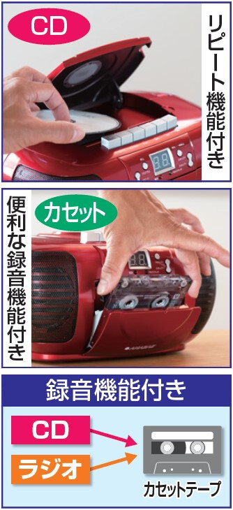 ●CD:リピート機能付き、カセット:便利な録音機能付き、録音機能付き:CD・ラジオ→カセットテープ