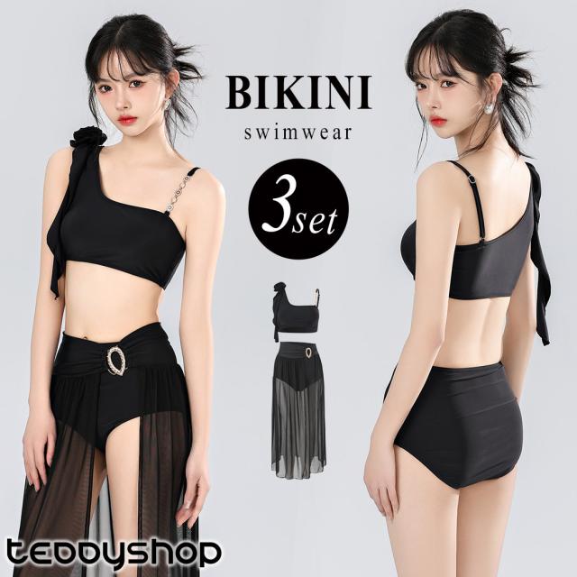 夏新作 水着 アシンメトリー ビキニ スリット シアー スカート 体型カバー水着 3点セット レディース セパレート 花 フラワー リボン コサージュ パール調 チェーン 肩紐調整 アジャスター ウエスト お腹 ヒップ 太もも 脚 カバーアップ 黒 海
