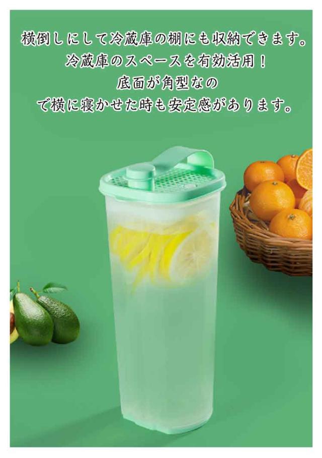 | スタイリッシュ&美カラーのピッチャー 冷蔵庫内にコンパクトに収まるスタイリッシュなピッチャー。 肉厚でしっかりしたボディはガラスのような透明感。 中身がすっきり美しく見えます。 横倒しにして冷蔵庫の棚にも収納できます。冷蔵庫のスペースを有効活用!底面が角型なので横に寝かせた時も安定感があります。 冷蔵庫のドアポケットOK 冷蔵庫のドアポケット前列にぴったり収まります。 漏れにくく開け締めしやすい 手がかけやすく開閉しやすいD型形状のフタ。注ぎ口は、フタをひねって開けるネジ式でしっかり閉まって液モレがありません。 お手入れラクラク シンプル構造でパーツが少なく、広口で奥まで手が入るので、お手入れ簡単。 | |