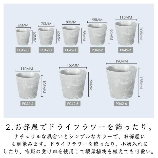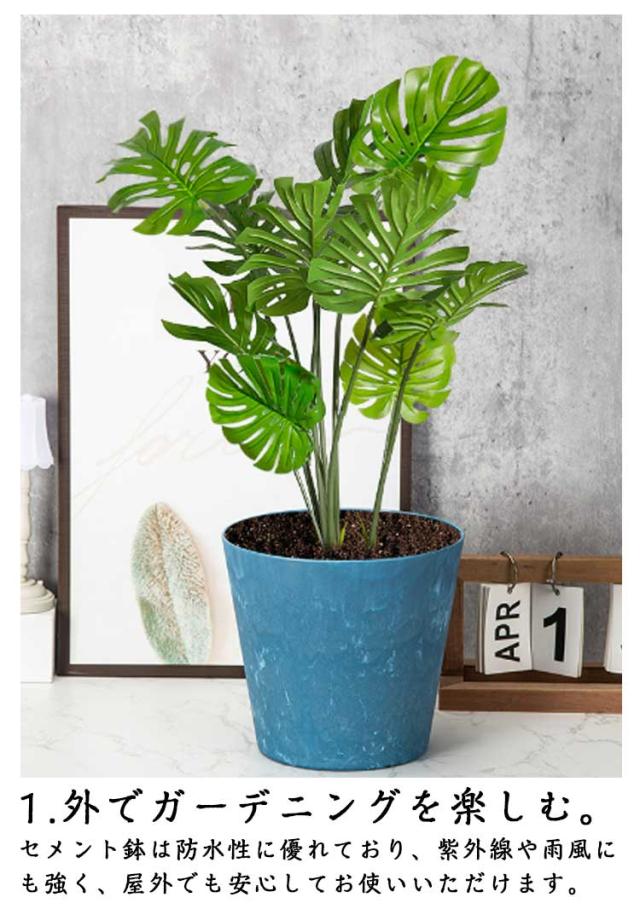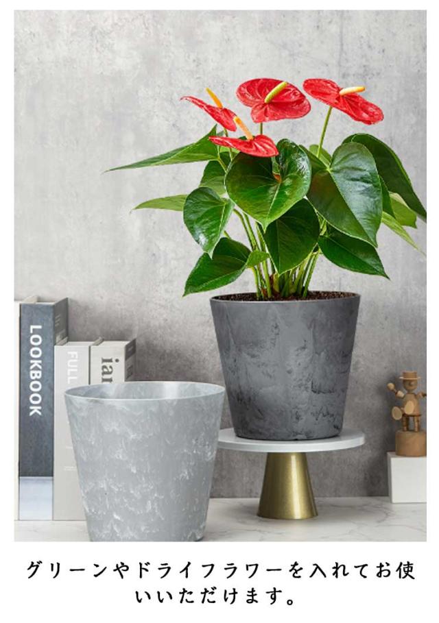| 質感に魅せられる植木鉢。 クールでスタイリッシュな雰囲気がおしゃれなフラワーポット。 グリーンやドライフラワーを入れてお使いいただけます。 置いているだけで、様になる—。 まるで石のような立体感のある質感が、おしゃれな雰囲気を醸し出します。 一つ一つ違う表情をお楽しみいただけます。 1.外でガーデニングを楽しむ。 セメント鉢は防水性に優れており、紫外線や雨風にも強く、屋外でも安心してお使いいただけます。 2.お部屋でドライフラワーを飾ったり。 ナチュラルな風合いとシンプルなカラーで、お部屋にも馴染みます。 ドライフラワーを飾ったり、小物入れにしたり、市販の受け皿を使用して観葉植物を植えても可愛い。 底穴がついておりますので、植木鉢としてご使用いただけます。 | |