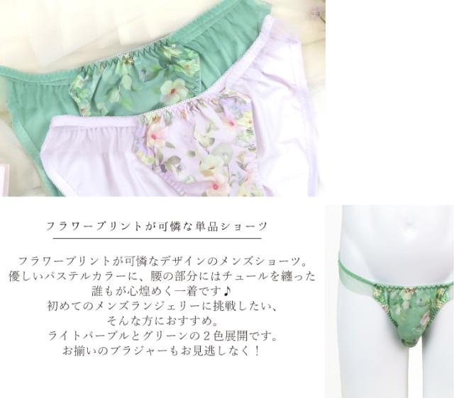 フラワープリントが可憐なデザインのメンズショーツ。優しいパステルカラーに、腰の部分にはレースを纏った誰もが心煌めく一着です♪初めてのメンズランジェリーに挑戦したい、そんな方におすすめ。ライトパープルとグリーンの2色展開です。お揃いのブラジャーもお見逃しなく!