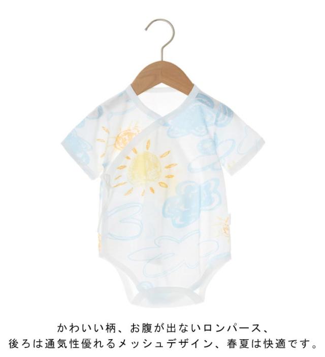 | 夏に快適!背中全面メッシュロンパース。 かわいい柄、お腹が出ないロンパース、後ろは通気性優れるメッシュデザイン、春夏は快適です。 寝かせたままのお着替えもラクチンなサイド紐結び全開きタイプで、肌着としてはもちろん、お部屋着としても大活躍の人気アイテムです。 肌に優しい上質な綿コットン生地、蛍光剤を一切使用してないので、新生児でも安心してお使いいただけます。 | |