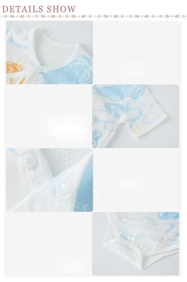 | 夏に快適!背中全面メッシュロンパース。 かわいい柄、お腹が出ないロンパース、後ろは通気性優れるメッシュデザイン、春夏は快適です。 寝かせたままのお着替えもラクチンなサイド紐結び全開きタイプで、肌着としてはもちろん、お部屋着としても大活躍の人気アイテムです。 肌に優しい上質な綿コットン生地、蛍光剤を一切使用してないので、新生児でも安心してお使いいただけます。 | |