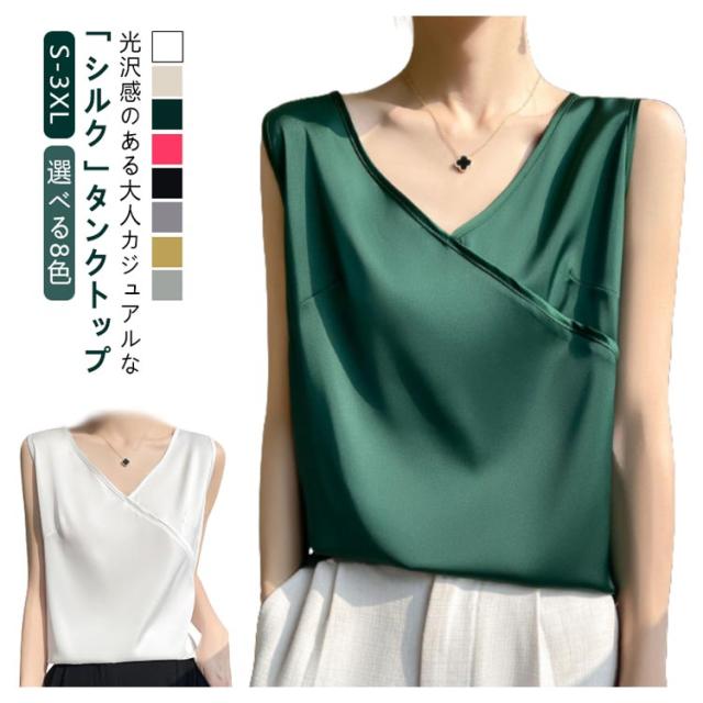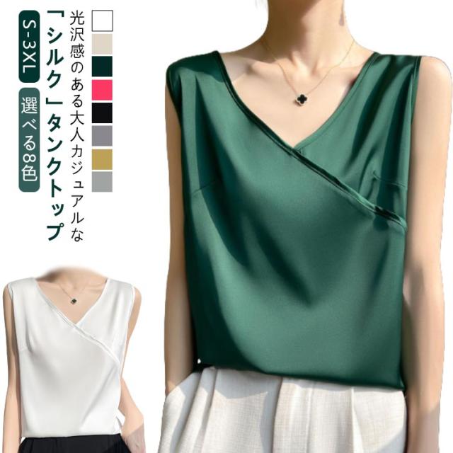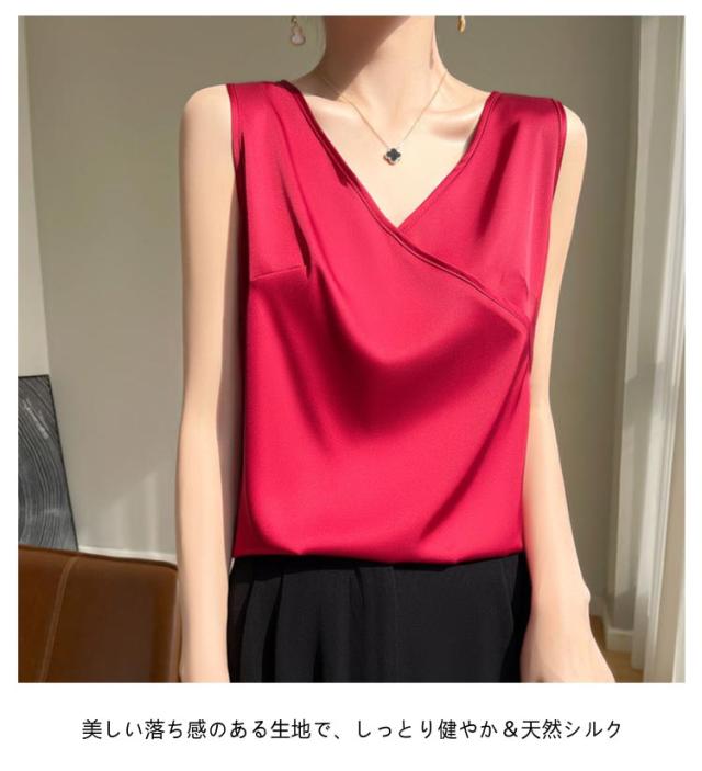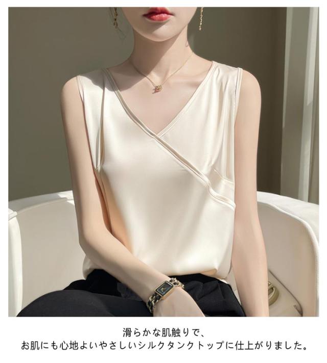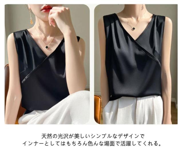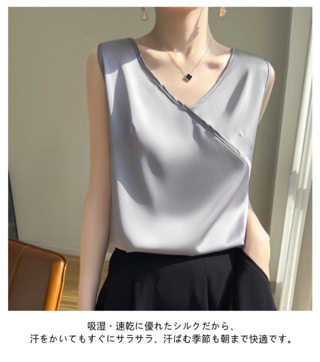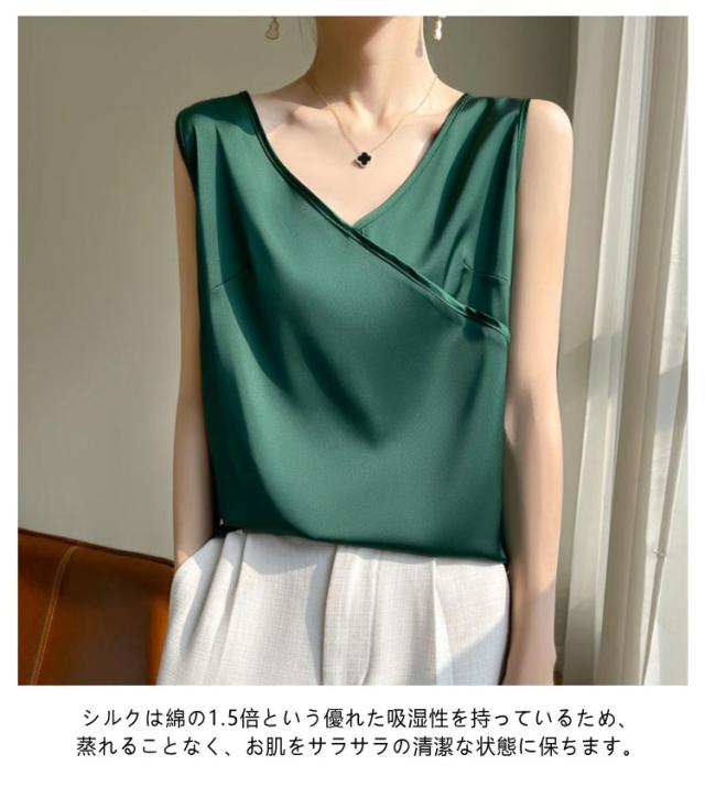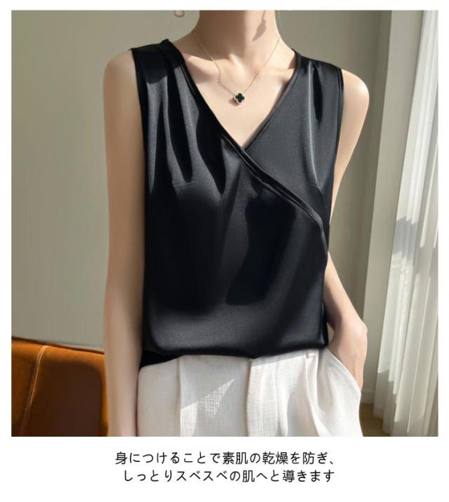 美肌 シルク シャツブラウス トップス 薄手 タンクトップ ゆったり サテン ブラ紐隠し インナー キャミソール 上品 光沢感 吸湿 通気性 保湿 キャミソール 敏感肌 大人 普段着 夏 黒 白 大きいサイズ